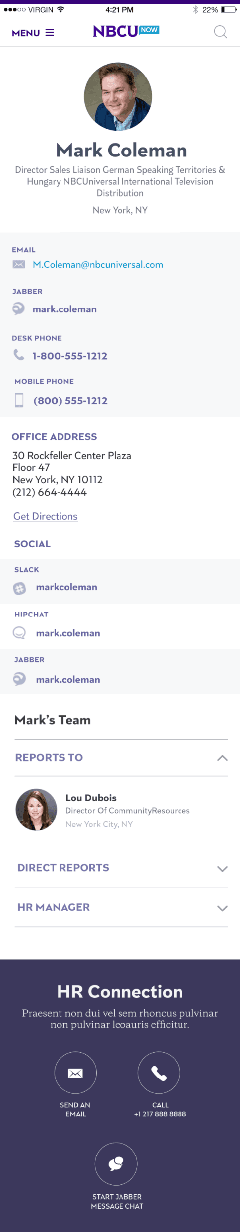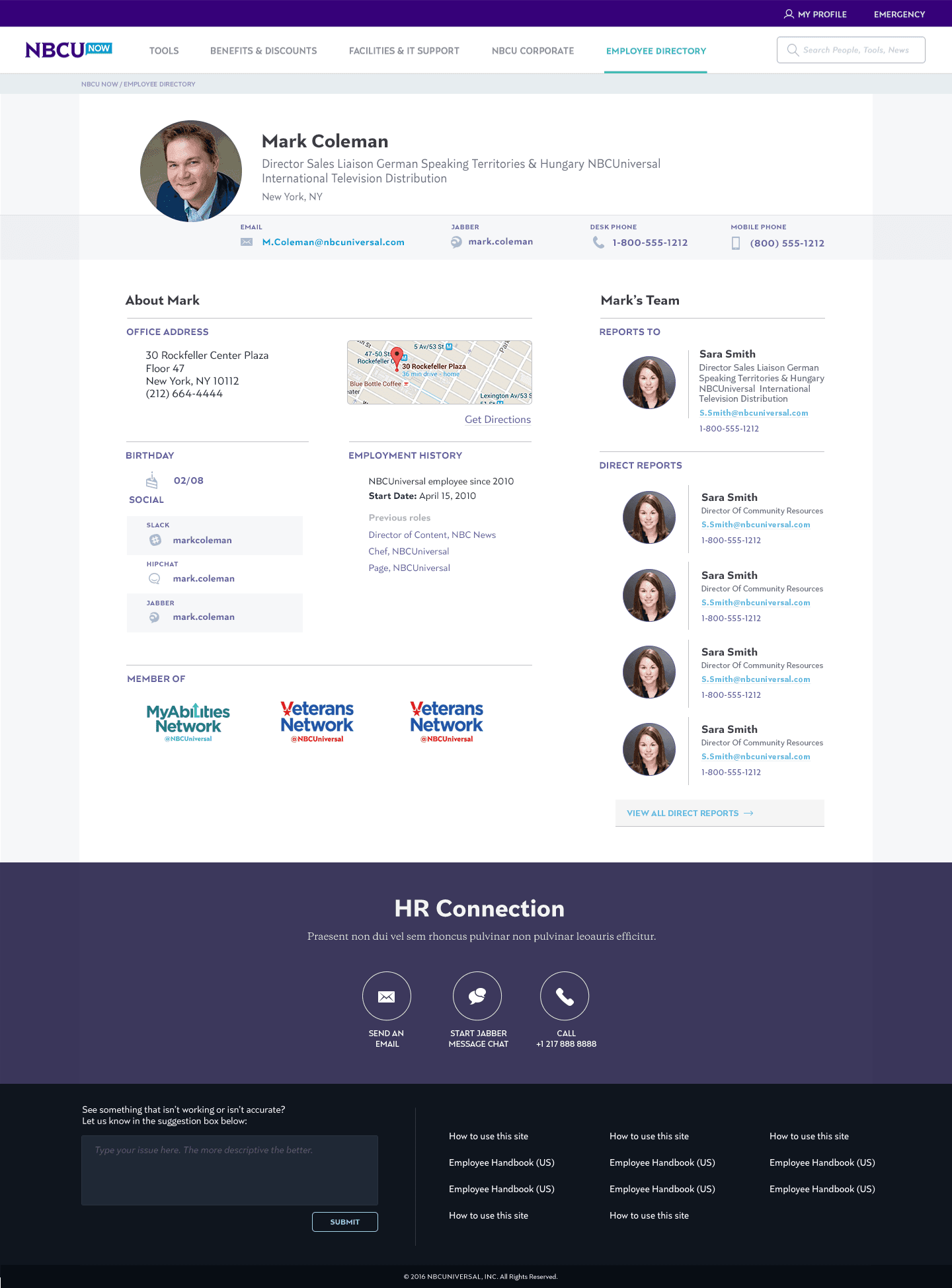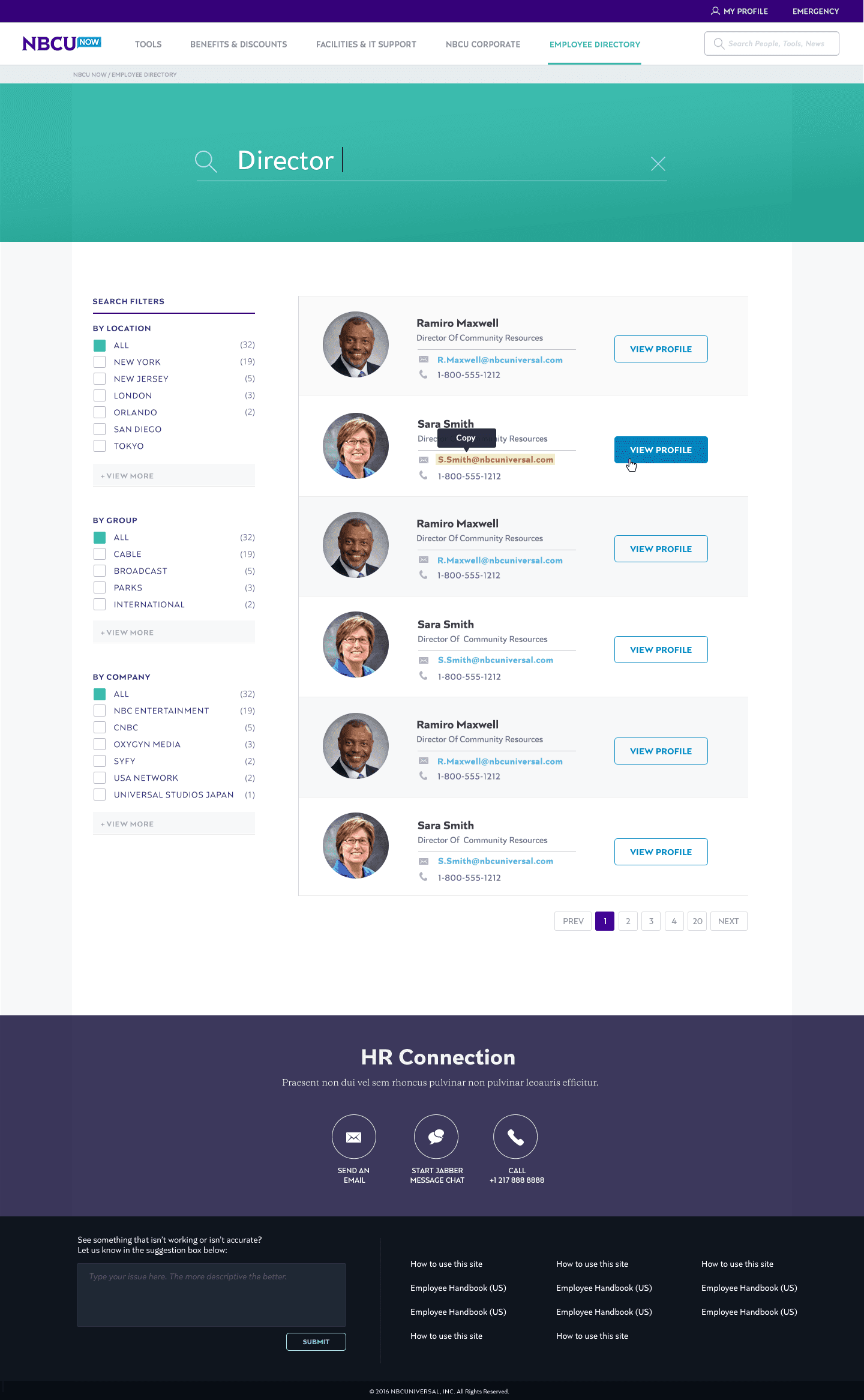 The Solution: NBCU Now: A multifunctional internal professional network featuring customizable news feeds, comprehensive employee directory, intuitive search capabilities, and scalable content architecture supporting 65,000+ unique items across global offices in a responsive, mobile-first design system.