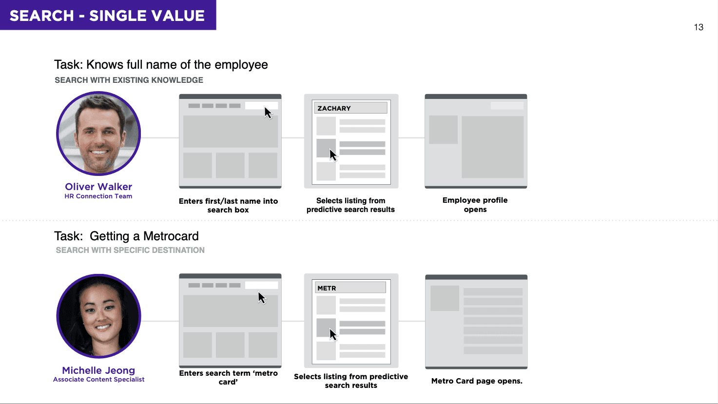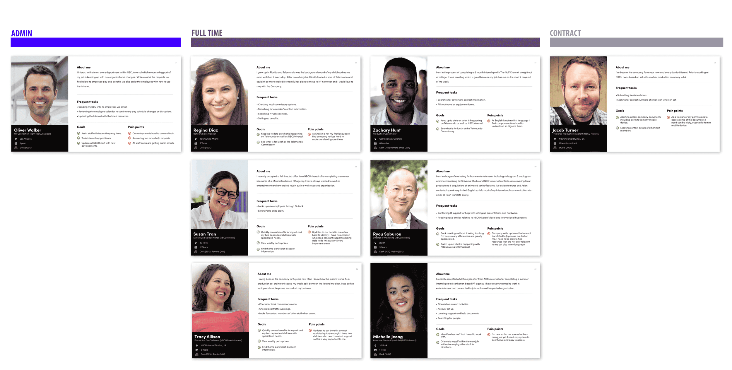 These insights enabled us to construct 8 user personas representing unique NBCU employee archetypes, which became the framework for design studios and feature prioritization.